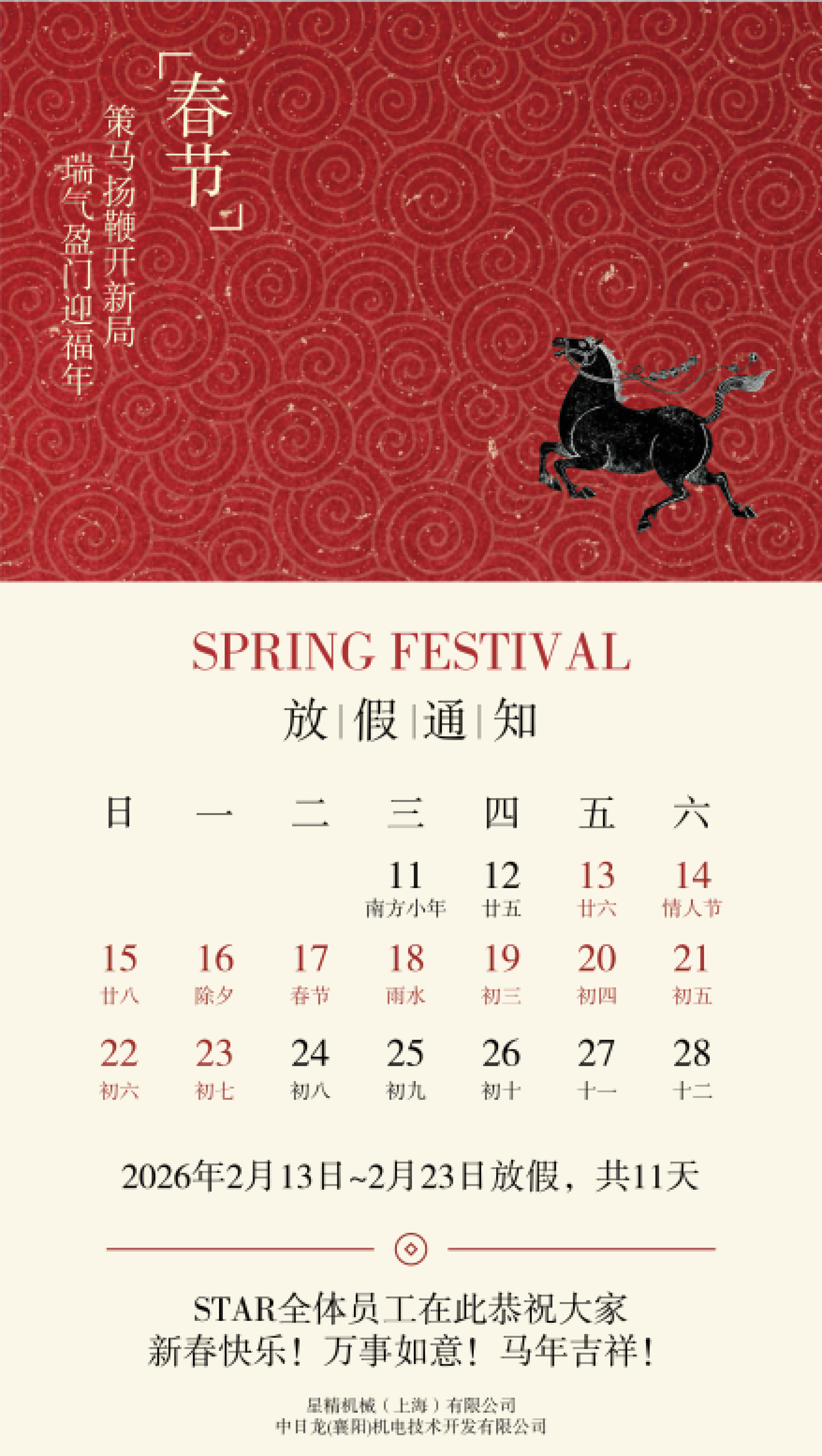 尊敬的各位客戶/協(xié)力廠商: 感謝大家一直以來(lái)的支持與關(guān)照。STAR中國(guó)集團(tuán)根據(jù)春節(jié)假期情況,安排于2026年2月13日(臘月廿六)~2月23日 (正月初七)放假,2月24日(正月初八)正式上班。 以上,敬請(qǐng)知悉,不便之處,敬請(qǐng)諒解! 放假期間售后支持電話: 成工(18036101692) 黃工(13923427722) eins安宜思夾具部品支持電話: 戴工(13924637472) 劉工(18820901601)